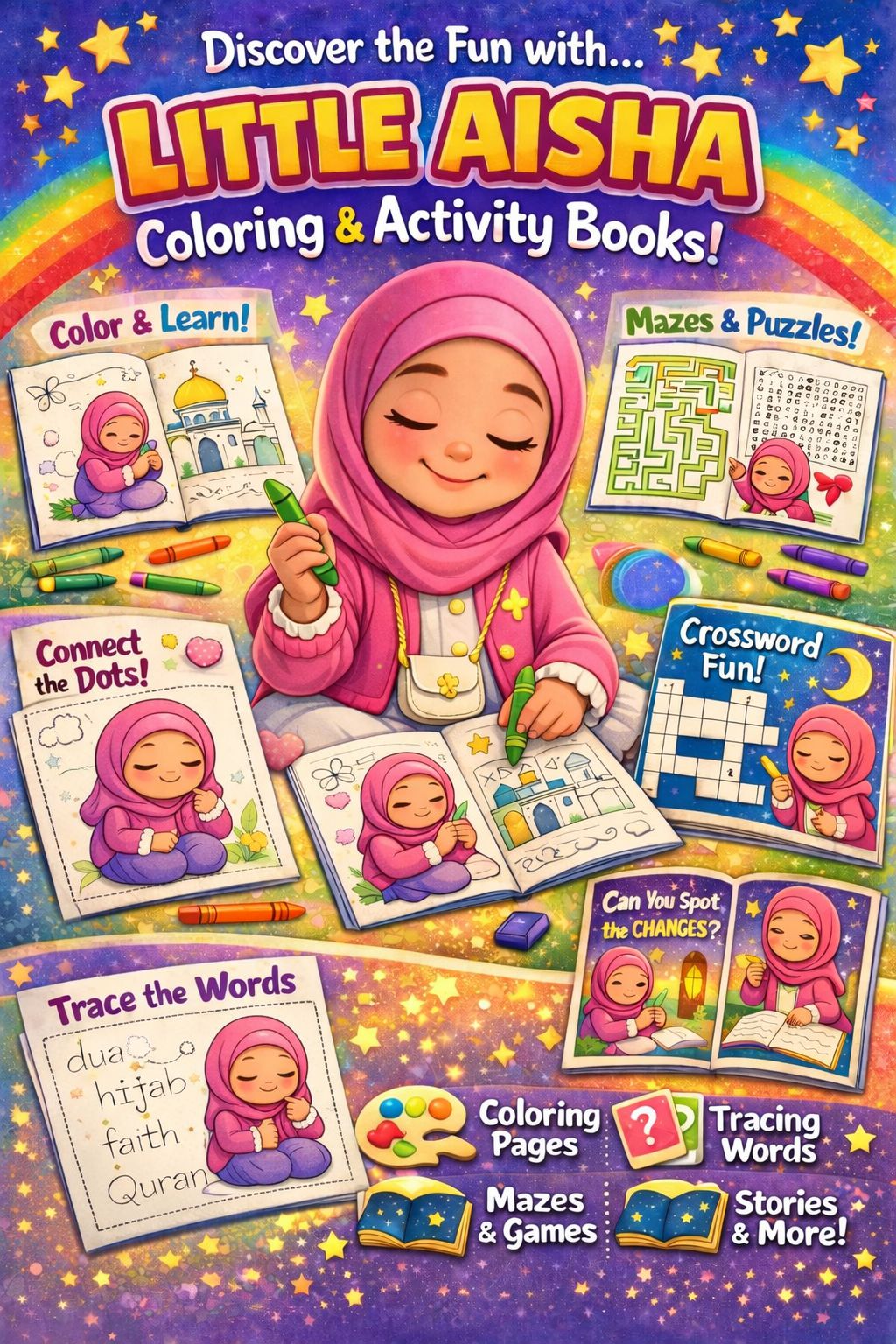 Introduce your child to a beautiful world of creativity, kindness and Islamic values with the Little Aisha Coloring & Activity Books – a thoughtfully designed activity series created especially for Muslim children.